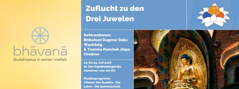 Vom 3. bis 5. Juli 2026 bietet bhavana bereits im fünften Jahr in Folge die Zufluchtnahme zu den Drei Juwelen – Buddha, Dharma und Sangha – im Zen Dojo Shobhogendo in Hannover an. Die ordinierte Zen-Lehrerin Dagmar Doko Waskönig und die Nonne in tibetischer Tradition, Tsunma Konchok Jinpa Chodron, gestalten dieses Ritual einmal jährlich traditionsübergreifend im Rahmen der Deutschen Buddhistischen Union (DBU). „So verbleibt denn also, Ananda, dass ihr eure eigne Leuchte und eure... → mehr