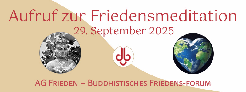 Wir laden jeweils am letzten Montag des Monats um 20.00 Uhr alle Buddhistinnen und Buddhisten ein, zeitgleich und gemeinsam für den Frieden zu meditieren und zu beten – undabhängig davon, wo man sich dann gerade aufhält. Das könnt ihr alleine oder mit euren Sanghas oder Gruppen tun, jeweils auf eure eigene Art und Weise, mit Texten, Gebeten, Gesängen, Gedichten, so wie es euch inspiriert.