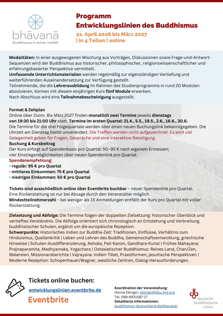 Am 21. April 2026 startet bei bhavana der einjährige Kurs ‚Entwicklungslinien des Buddhismus‘ mit Dr. Karsten Schmidt. Er beleuchtet die historische Entwicklung vom frühen Buddhismus über Mahayana und Vajrayana sowie die interkulturelle Begegnung mit anderen Religionen: