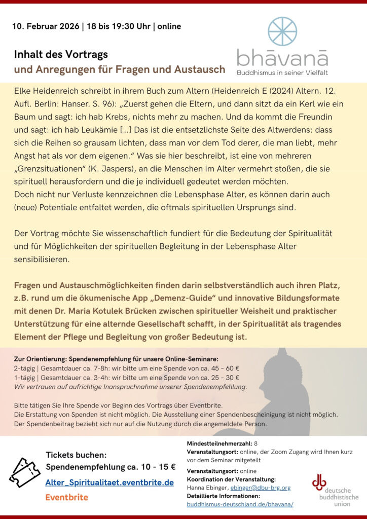 Am 10. Februar 2026 findet der online Vortrag ‚Verletzliches Alter‘ mit Dr. Maria Kotulek von 18 bis 19:30 Uhr bei bhavana statt. Die Religionspädagogin möchte in ihrem Vortrag wissenschaftlich fundiert für die Bedeutung der Spiritualität und für Möglichkeiten der spirituellen Begleitung in der Lebensphase Alter sensibilisieren. Fragen und Austauschmöglichkeiten finden darin selbstverständlich auch ihren Platz, z.B. rund um die ökumenische App „Demenz-Guide“ und innovative Bildungsformate mit denen Dr. Maria Kotulek Brücken zwischen spiritueller Weisheit und praktischer Unterstützung für eine alternde Gesellschaft schafft, in der Spiritualität als tragendes Element der Pflege und Begleitung von großer Bedeutung ist.